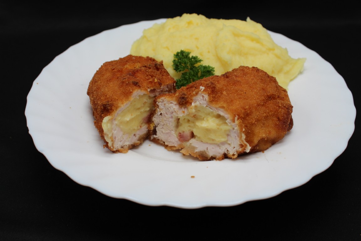 Kuracia roláda plnená bryndzovo zemiakovou plnkou (cibuľa, slaninka) v trojobale, zemiaková kaša