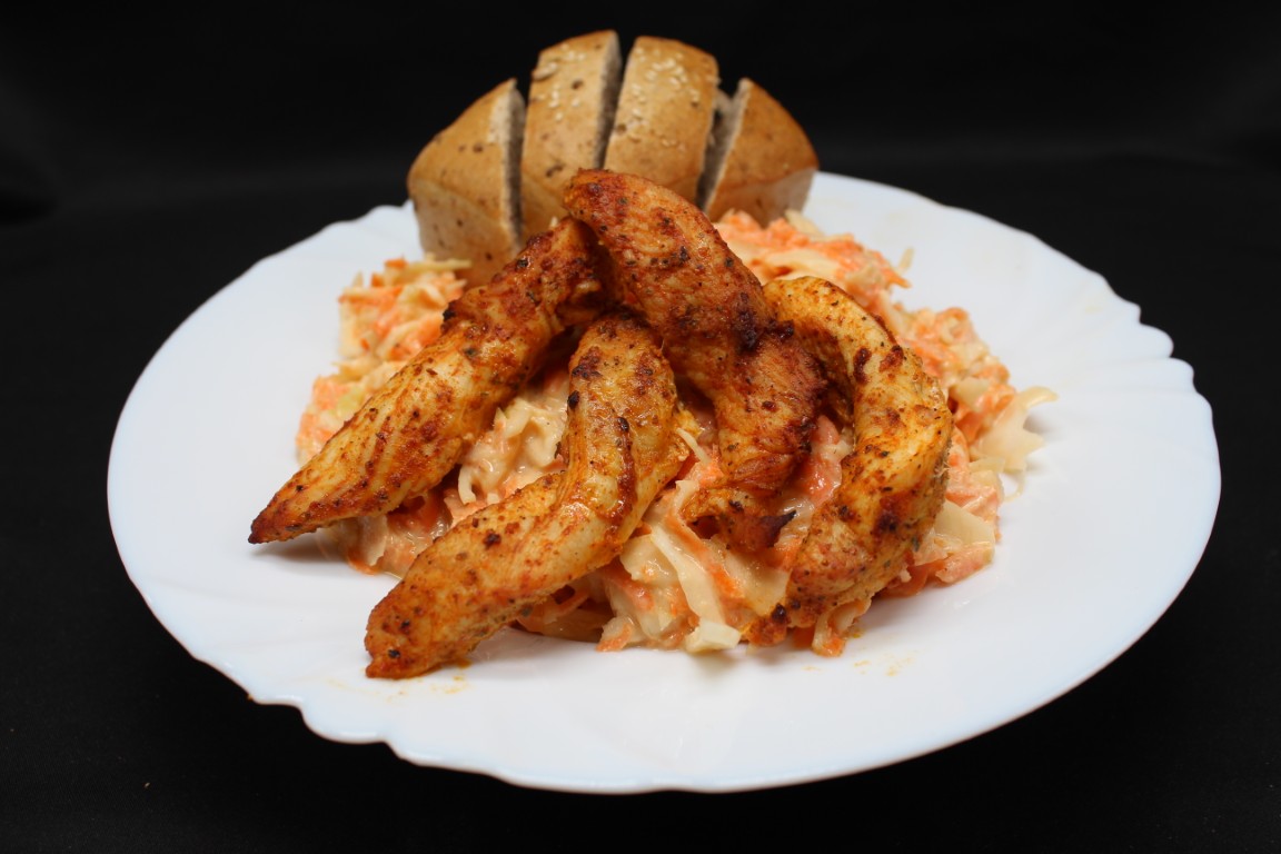 Fitness coleslaw šalát s jogurtom a grilovanými kuracími stripsami, celozrnné pečivo