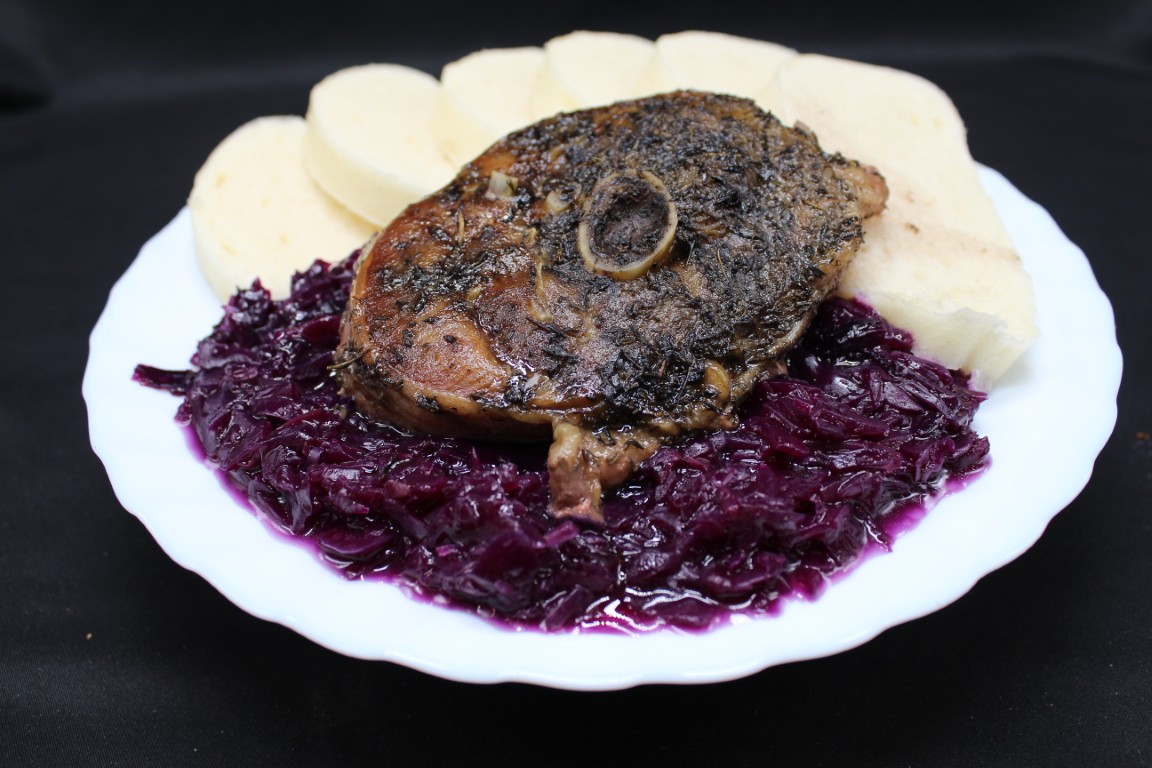 Morčacie osso buco zo stehna (Plátky morčacieho stehna s kosťou na šťave), červená kapusta s jablkami, parená knedľa